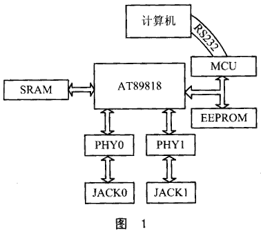 本交换机系统采用AT89818作为核心交换芯片;MCU采用AT89C52,用做控制和系统设置,已经和计算机进行通信连接;EEPROM采用AT93C46,用于储存交换机启动时所需的初始化数据;SRAM采用64K×64位的W25P243A;PHY0和PHY1采用8端口的DSP 10/100 PHY;JACK0和JACK1为RJ-45连接器。系统结构如图1所示。