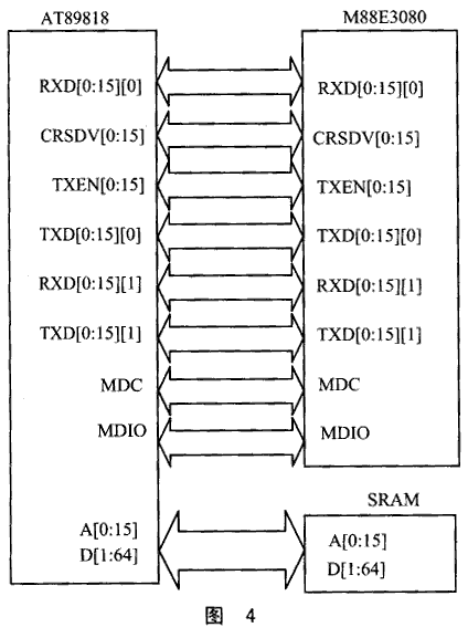 AT89818与M88E3080以及SRAM的连接如图4所示。MDC为交换芯片输出的1MHz时钟,用于驱动PHY芯片。为增加驱动能力可考虑先通过缓存器,MDIO为交换芯片管理PHY芯片所用的DATA线。
