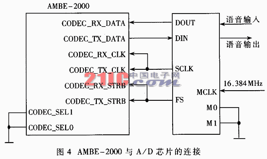 本系统中,A/D、D/A芯片采用TLV320AIC10。TLV320AIC10是TI公司的线性PCM编解码芯片,芯片内部具有ADC模拟抗混迭滤波器和数字FIR滤波器,有良好的抗混迭和抗噪声能力,具有可编程的输入输出增益控制、可编程的ADC和DAC转换速率控制,工作电压为3.3V~5V,还具有低功耗工作模式。 AMBE-2000与TLV320AIC10的连接如图4所示。CODEC_SEL?眼1~0?演在硬件上接地,设置A/D方式为16位线性PCM,其晶体频率采用16.384MHz,帧同步时钟和位同步时钟均由TLV320AIC10产生,并提供给AMBE-2000。