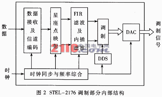 前向纠错编码模块接收解调出的I、Q两路信号,进行星座点映射,恢复数据,再对应于调制端解出帧结构,依次进行解交织、信道解码(RS码)、解扰,以串行或并行方式输出原始信号,可以输出MPEG-2结构的信号。 时钟模块由采样钟和恢复出的符号钟产生解调部分所需的各种时钟信号。 3.2 调制部分 图2为STEL-2176调制部分的内部结构,主要由数据接收及信道编码模块、星座点映射模块、FIR滤波器及内插滤波器、调制模块、DAC(数模转换)模块、时钟模块等组成。 ·数据接收及信道编码模块 接收串行输入的原始数据,进行信道编码(RS码),包括交织和加扰,这些处理都是可选的。 ·星座点映射模块 将串行比特流映射到指定星座图的星座点上,分I、Q两路输出。 ·FIR滤波器及内插滤波器 I、Q两路信号分别通过成形滤波器(32级的FIR滤波器)滤波后,输出到内插滤波器。内插滤波器大大提高了信号的采样频率,以满足大于2倍的载波信号的要求,与正交调制所需的速率相匹配。 ·调制模块 调制模块由DDS(直接数字合成器)和乘法器构成的正交调制器。I、Q两路信号分别与DDS产生的SIN和COS载波信号相乘,合成后输出。 ·数模转换模块 最后将数字信号转换为中频模拟调制信号输出,这时的信号带有相对于主钟频率的镜像信号,即输出的模拟信号需要片外滤波。 ·时钟模块 时钟模块与外部时钟同步并产生调制部分所需的各种时钟信号。 3.3 监控部分 通过STEL_2176的监控模块串行或并行地接收外部的配置命令,发送状态信息。对STEL_2176的监控通过访问其内部寄存器实现。 4 STEL-2176技术特点 STEL-2176运用了全数字调制解调技术,与传统的调制解调器相比,在系统稳定性、可靠性以及传输速率、载波速率和调制模式的灵活性上占有优势。 4.1 高集成度、低功耗的芯片技术 STEL-2176使用0.35μm线宽的CMOS芯片技术,集成度高,提高了系统的稳定性和可靠性;工作电压为较低的+3.3V,大大降低了芯片功耗,而在接口处灵活地提供了可选的I/O电压(+5V/+3.3V)。 4.2 宽带ADC/DAC 这是全数字调制解调技术的标志性技术,尽可能在信号通道的前端将模拟信号转换为数字信号,以充分发挥数字信号处理技术的作用。 STEL-2176采用了10bit的ADC和DAC,能处理近10 MHz带宽的模拟信号。因为采用带通采样技术,模拟信号中心频率可达几十兆赫。 4.3 使用了DDS技术和多速率信号处理算法