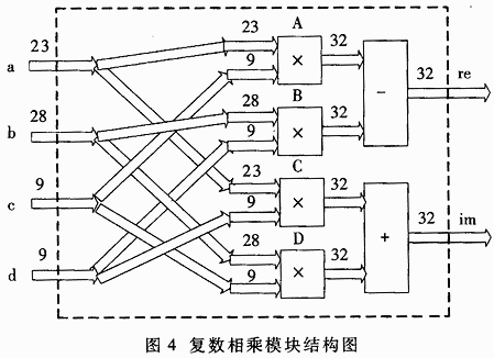 复数相乘模块是相关运算部分中的重要环节。从RAM中读出的实部和虚部组成的信号值,与从ROM中读出的本地序列值,在这里要进行复数相乘运算。复数相乘模块结构图如图4所示,a、b、c、d分别代表信号和本地序列的实部和虚部,按照式子(a+jb)×(c+jd)=(ac-bd)+j(ad+bc)的组合进行相乘加减。这里需要说明的是,考虑到后面要与DSP相连,数据的宽度被限制在32位。所以对于乘法器B和D而言,28bit与9bit相乘得到的结果应是37bit。这里在定制乘法器的时候强行把它限制为32bit,去掉了最高位的多余符号位,舍去了低4位。这样处理带来的后果就是人为地将乘积缩小了16倍。如果对乘法器A和C的结果不做处理,直接进行加减运算,则结果将导致严重的错误。因此对于乘法器A和C,应该人为地将其输出值右移4位,同样地缩小16倍,再进行下一步的加减运算,就可以有效地避免上述的错误。这样输入的4个数值经过几个时钟周期的运算后,输出的两个数值就是所求的复数相乘结果。这里的4个有符号数乘法器都会在编译时自动地配置到Stratix器件的嵌入式DSP模块上去。