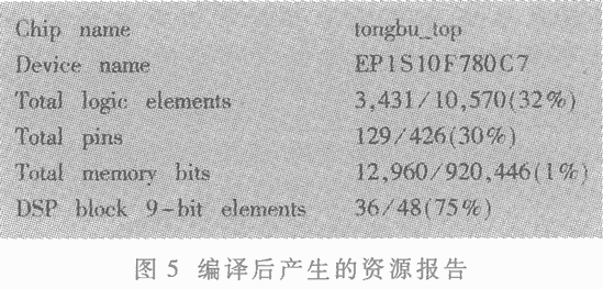 各子模块设计好后,可以用图形方式或文本方式将各个模块连接起来,对顶层设计进行编译。这里选用的是Stratix系列中容量最小的一种:EP1S10F780C7,编译后产生的编译报告如图5所示。