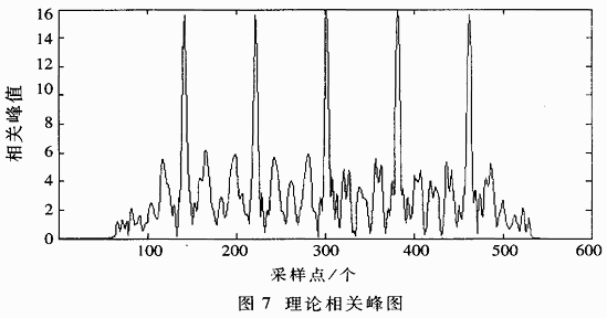 编译完成后即可进行仿真和校验,这部分可分为三个过程。对于同一块数据,先在Quartus下进行仿真,产生出一系列相关值。然后在MATLAB环境下利用其绘图方便的特性,完全按照FPGA中各模块处理数据的方法,编一段程序对数据进行处理,并画出处理结果的图形,如图6所示。理论上其处理结果应和Quartus的仿真结果完全一样,实际比较得出两者确实完全一样。最后在MATLAB中从理论上运用纯软件的方法编一段程序,对数据进行处理,并画出处理后的相关峰图,如图7所示。