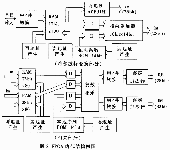 数字相关器在短波扩频通信系统中的具体功能是:接收A/D采样后的采样信号,对采样信号进行希尔波特变换,得到与其正交的另一路信号;然后以这两路信号分别作为实部和虚部,与本地序列进行相关运算,将相关值的实部和虚部送给DSP做后续处理,如图1所示。只有包含有正确同步头信息的信号经采样后与本地序列作相关运算,得到的相关值的模值才会出现峰值;对应于发端特定的同步头帧结构,相关后的相关峰也会出现规律性的特征。这样,DSP才可以通过先对相关值求模,然后对模值出现的峰值的间隔、幅值和数目等信息进行判断和进一步处理,来确定是否捕捉到信号。下面具体介绍完成上述数字相关功能的FPGA的设计。FPGA设计的内部结构框图如图2所示。