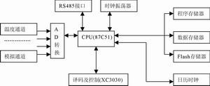 本系统的主控芯片是MD87C51单片机,负责整个模块的协调工作,主要任务包含:与主计算机通过RS-485通信、将采集的数据记录在大容量的闪存中,这里使用了XILINX公司的XC3030来对地址进行译码,使得单片机能够访问大容量的闪存。日历时钟电路主要实现准确计时的任务,包含:接收主计算机下发的系统时间,对本时钟电路进行授时,保证主计算机和本电路的时间同步;通过计时器对时间进行累计,与主控芯片MD87C51通过串口通信。A/D转换电路主要由AD7824实现,用以采集系统所需的相关数据,通过单片机总线传送给主控模块MD87C51。