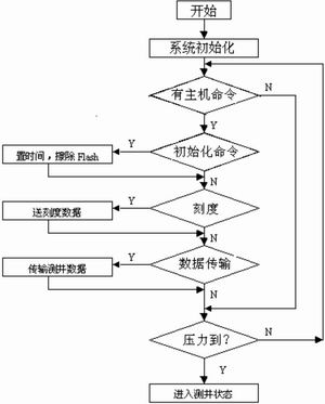 上电复位后,首先进行系统的初始化工作,随后查询主计算机是否发送命令,判断命令类型,根据相应的初始化命令、刻度命令、数据传输命令或者压力到达临界值命令,进行设置时间、 送刻度数据、传输测井数据或者进入测井状态等操作。