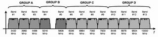 MBOA方案的频带计划将频带分为A-D四组,如图1所示。 其中B组(4.9GHz - 6.0 GHz)和D组(8.1GHz -10.6GHz)留待以后使用。