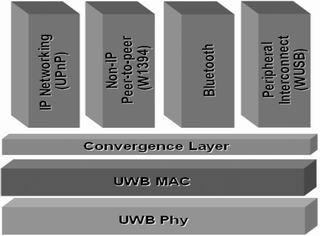 UWB无线的概念已渗透到多种不同应用和行业,并成为公认的“通用UWB无线平台”。UWB无线与融合层一起,已成为不同应用的基本传输机制,其中有些应用目前仅支持有线连接。通用UWB平台上运行的一些更重要的应用包括通用串行总线(USB)、IEEE 1394、下一代蓝牙和通用即插即用(UpnP)- 参见图2。