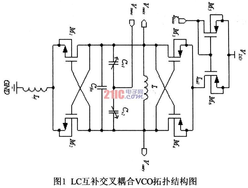 相对单NMOS或PMOS交叉结构VCO而言,互补交叉结构VCO的输出波形更对称,噪声特性更好。因此本文选择互补交叉结构的VCO,电路拓扑结构如图1所示。根据LC振荡器基本理论,该VCO的输出频率为