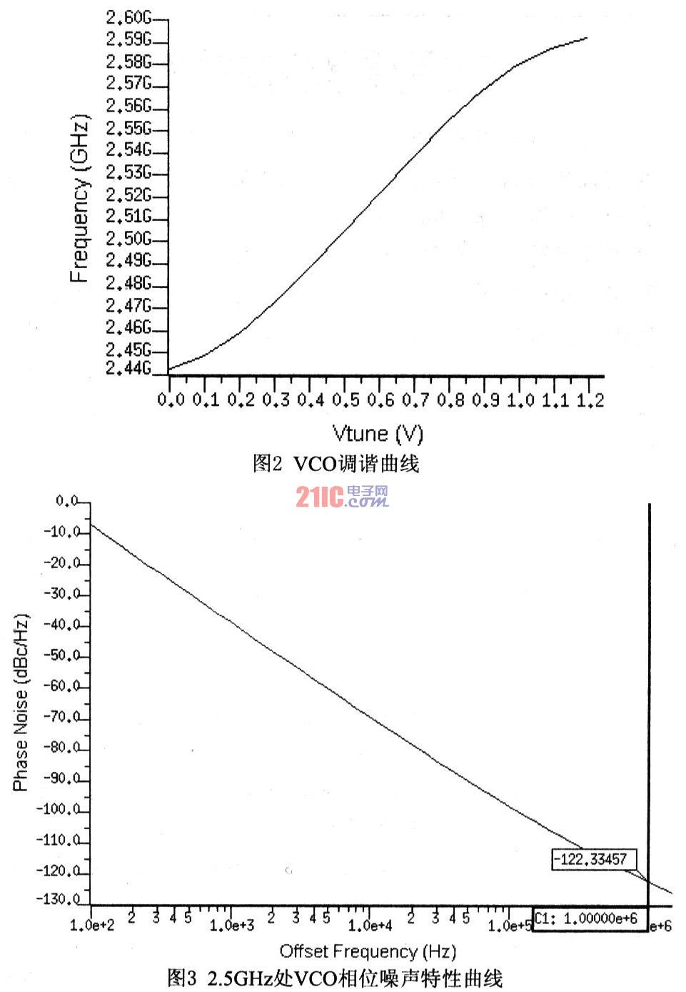 经Mentor Graphics Eldo仿真,VCO调谐曲线如图2所示,当调谐电压由0V变化至1.2V时,VCO的输出频率从2.44GHz增大至2.59GHz。在2.5GHz中心频率处的相位噪声特性曲线如图3所示。