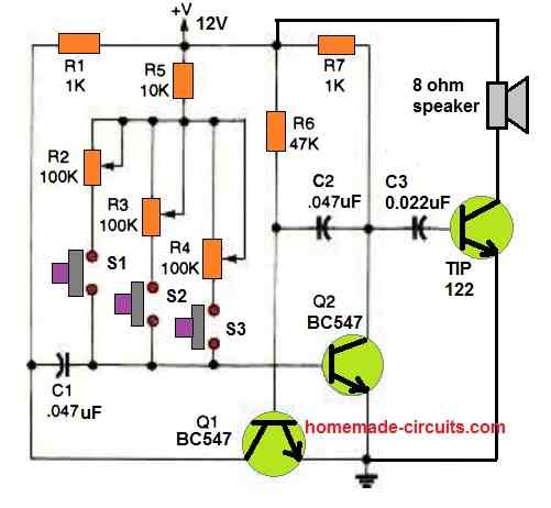 它是一个简单的2晶体管振荡器电路,具有3个可调频率范围,用于在输出扬声器上产生3个不同的音调频率。