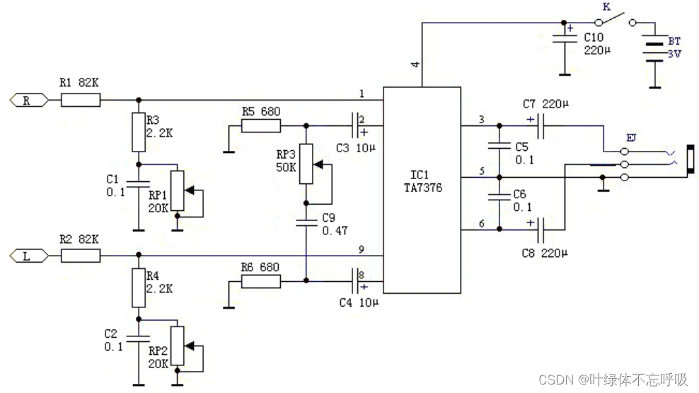 由电阻电容组成的低频增强电路。利用功率放大器 IC 的反馈输入,组成立体声反相合成电路。利用功率放大器 IC 组成头戴耳机的驱动电路。从输入端 IC 之间的电阻电容起到增强低频特性的作用,因为加有电位器,低频部分的增强量可在 0–10 倍之间连续可调。立体声反相合成电路 IC 2 脚和 8 脚的直流耦合电容之后,由0.47µF 和 50K 的电位器组成。在此电路中,把立体声的广场效果成分中的高音部分左右分别反相后合成,起到增强效果的作用 。用东芝 TA7376P推动头戴式耳机。这种 IC 内藏两个通道,外接元件少,可在低电压下工作 。负载阻抗较低时,可重放出动人效果的低频声音 。电源若改用 5#电池,用四只串联,电压为 6V,可直接驱动高输出的扬声器。若将三个 200µF/10V 的电容增加到 1000µF 左右,可获得更好的效果。
