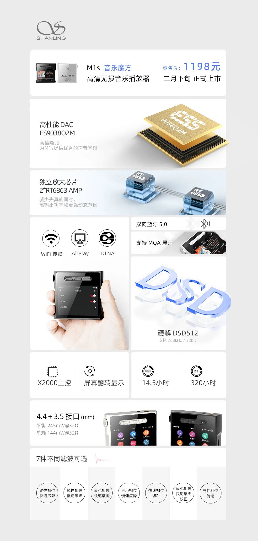 M1s,是围绕着“纯音机”这一概念,并针对千元级市场的需求进行设计规划的产品。所以在配置上会在同价位产品中具有领先优势。纵观众多M1s的高能看点,ES9038Q2M+双放大的音频配置属于千元独家,强悍的声学配置,令M1s拥有了同级别产品中一骑绝尘的声音水准。音频随意门赋予了M1s多场景工作和多设备互联的能力,无论是在家里、在外甚至是在通勤路上,都能使身边的音频设备更加高清无损地连接,达到更高水平的HiFi体验。X2000处理器强大三核结构带来自然纯净且酣畅淋漓的音频体验。4.4mm平衡接口等功能和配置也是同级别绝无仅有的。