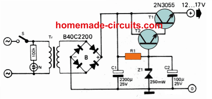 下图显示了紧凑型立体声放大器电路的稳压电源电路。