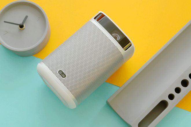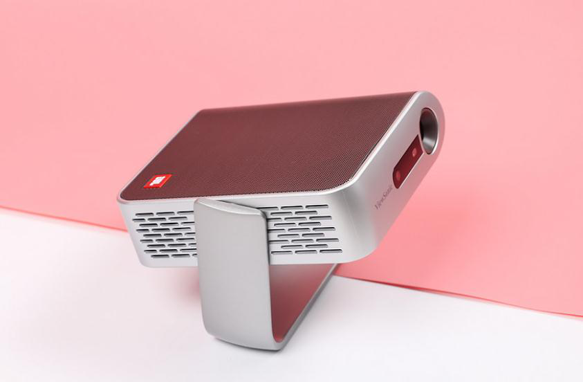 优派M1+的机型辨别度非常高,外观效仿了书本外形设计,配备三合一的金属支架,支架可用为保护镜头,同样也是开机的一种方式。机身采用了ABS与PC作为材质,主要以银白色与深灰色为主色;深灰色的外包“书皮”夹杂着银白色本体。支架可以360度无死角的旋转,同时也可以将镜头面向天花板进行投射,能够解锁更多的投影姿势。