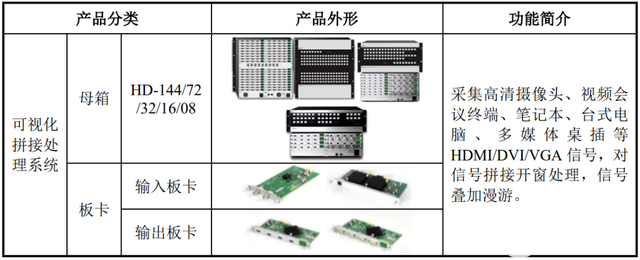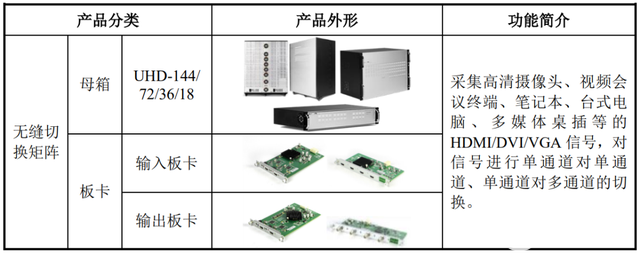 公司矩阵拼接类产品主要包括无缝切换矩阵和可视化拼接处理系统,每种产品均由母箱和输入输出板卡构成,具体列示如下: