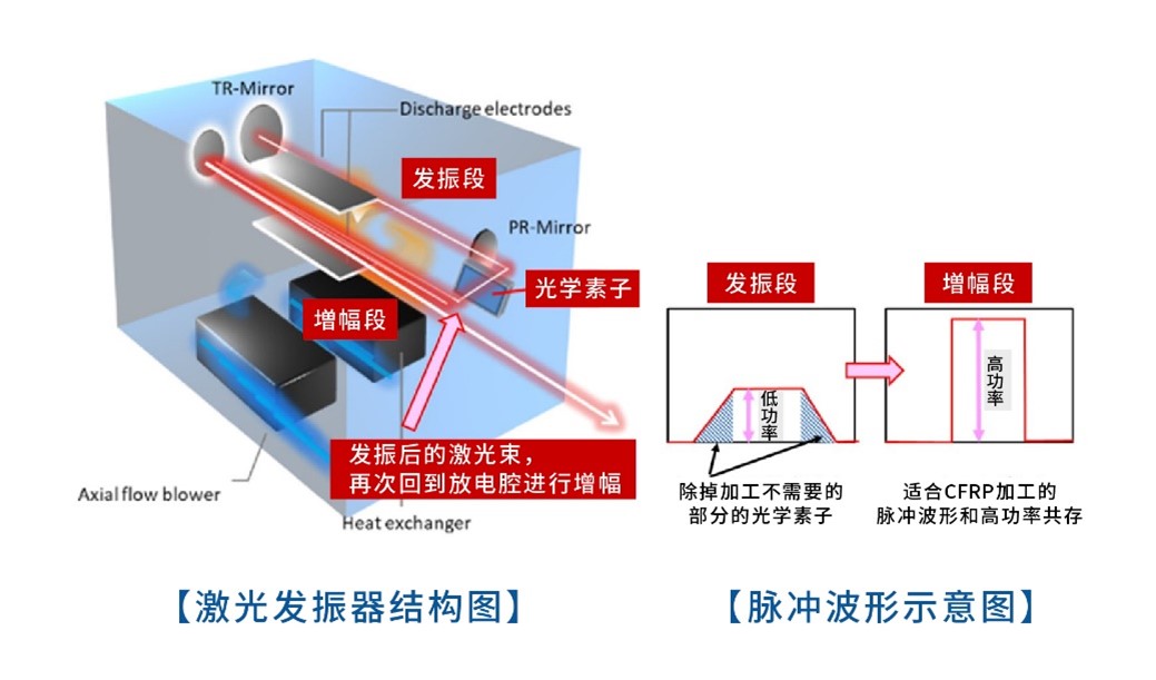 ·配备Integrated-MOPA※3方式的三轴正交型※4二氧化碳激光发振器,将振荡器和增幅器集成在同一个框体中,通过简单的结构发出适于CFRP加工的问题。