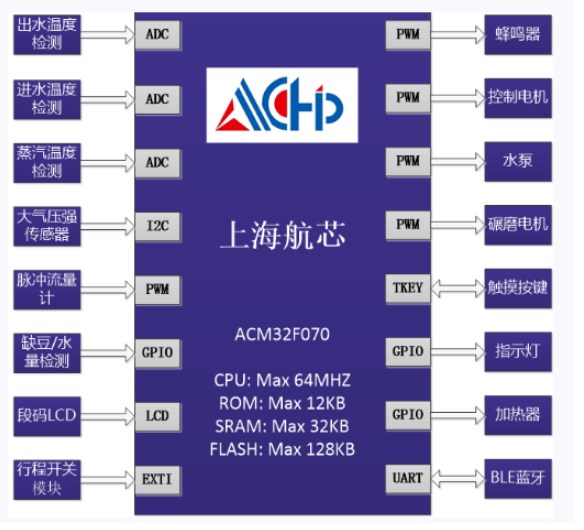 本文描述的咖啡机方案,基于上海航芯ACM32F070系列的MCU进行设计,整体的方案框图如下所示: