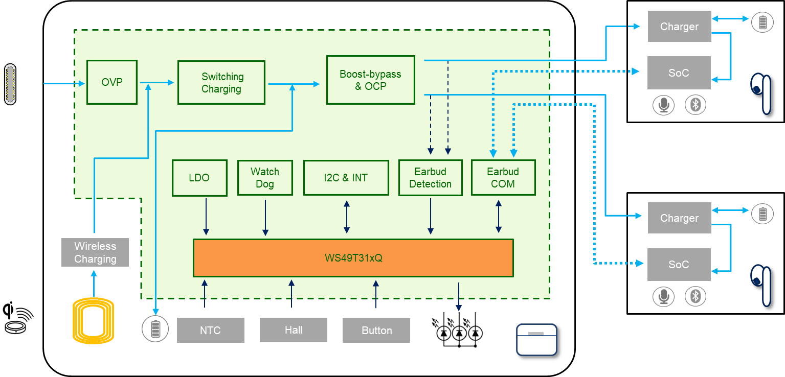 省 WS49T31xQ系列对功耗进行了优化设计, Standby mode功耗控制在1.5μA以下,低功耗特性大幅延长整机的续航时间,非常适合电池供电设备的应用。另外,数字,模拟,Core独立供电设计,数字接口可通过VDDIO自由选择1.8V~3.3V逻辑电平,极大的方便了外设的连接。我们仍以TWS耳机盒应用为例,与耳机通讯的UART接口设定为1.8V电平,ADC可以工作在3.3V,这样既可直接适配耳机端通信,又能够保证ADC采集的精度和量程,节省了电平转换的成本。最后,独立PWM模块可直接驱动2颗RGBLED,进一步节省了外围元器件。
