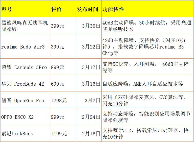 2022年Q1部分新款TWS耳机汇总(根据公开资料整理)