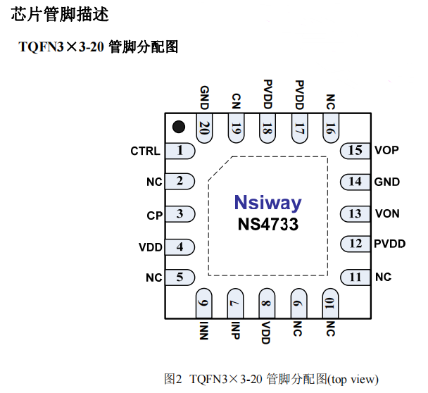 NS4733 采用 TQFN3×3-20 封装。额定的工作温度范围为-40℃至 85℃。