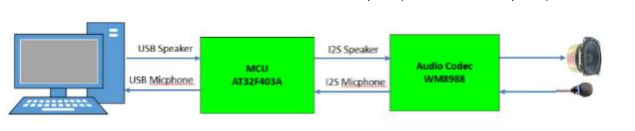 在本方案中AT32F403A通过USB Audio Class连接电脑,并通过I2S控制WM8988 Audio codec来实现完整的USB耳机功能,最终可达到16K/48K/96K音频采样率,并支持采样率切换、静音、音量调节、Feedback等功能。