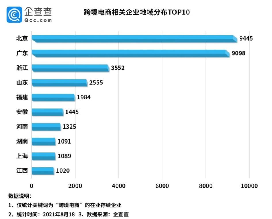 根据企查查的跨境电商企业统计数据,中国拥有跨境电商企业数量最多的其实并不是拥有深圳的广东省,而是北京市。前三名分别是北京9445家,广东9098家和浙江3552家。