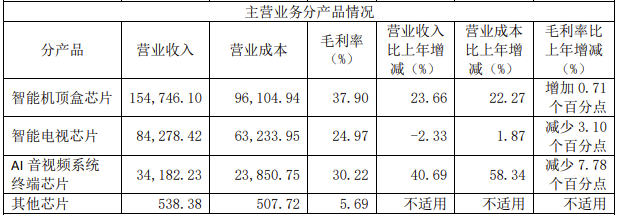 AI 音视频系统终端芯片业务迎来了一轮新的高速增长,销售收入与去年同期相比增长幅度达 40.69%,一方面,得益于长期培育海外市场逐步进入收获期,另一方面,公司推出新产品带来了新的业务增长点。