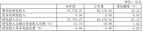 晶晨股份不断增大研发投入增强自主创新能力,保持技术优势。从 2016 年的 2.11 亿元增长到 2019 年的 4.62 亿元,占营业收入的 20%。2020 年公司研发投入为 5.7 亿,增长25.12%。