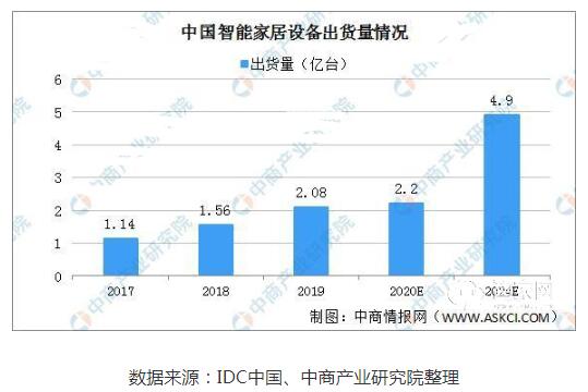 近年来,我国智能家居出货量快速增长。IDC报告数据显示,2017年中国智能家居设备市场规模仅1.14亿台,2019年中国智能家居市场出货量突破2亿大关,达到2.08亿台,较2018年增长33.5%。受疫情影响,2020年上半年中国智能家居设备市场出货量为9286.6万台,同比下降5.4%。2020年第三季度中国智能家居设备市场出货量约5112万台,同比下降2.5%。IDC预计,2020年中国智能家居设备市场出货量预计接近2.2亿台,同比增长4.0%,到2024年出货量将增长到近5亿台,年复合增长率高达23%。