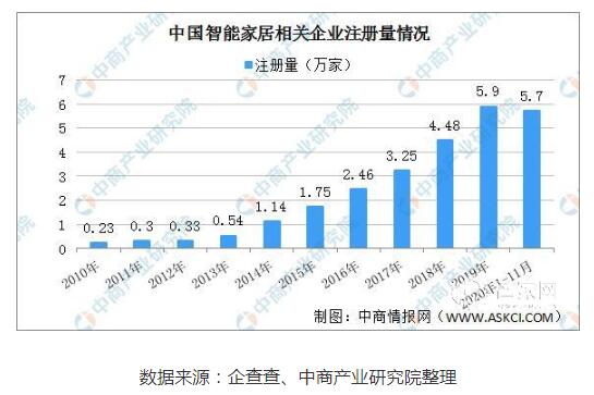 智能家居行业前景光明,企业争相布局智能家居产业,智能家居相关企业注册量持续增加。2010-2013年智能家居相关企业注册量小幅增加,2014年注册量突破1万家,此后智能家居相关企业注册量大规模增加。2019年智能家居相关企业注册量再创新高,达到5.9万家。2020年1-11月,智能家居相关企业注册量5.7万家。