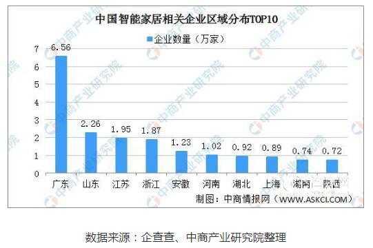 我国智能家居相关企业主要分布在广东、山东、江苏、浙江等地。其中广东智能家居相关企业数量最多达6.56万家,山东位居第二,智能家居相关企业2.26万家。江苏、浙江、安徽、河南智能家居相关企业数量超1万家。