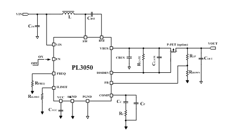 PL3050采用自动恒定频率的峰值电流模式控制。轻载时,PL3050工作与FCCM模式下,以避免产生低频噪音。