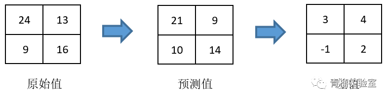 问题来了,这世上哪有那么牛的算法能计算预测得这么完美?是的,没有。那预测还有什么用?答案是为了获取他们的差。差值有什么用?因为差值的绝对值都很小。还是不明白?我们看下图的三个像素值矩阵: