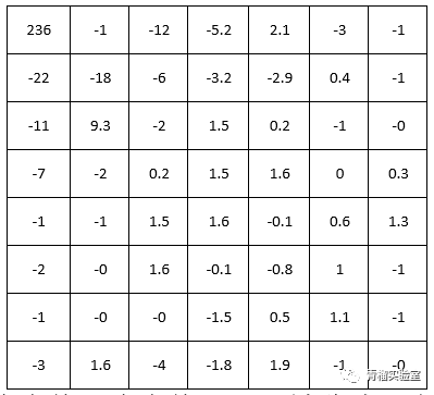 到现在为止,仍然没有进行实质性的压缩。万事俱备,只欠量化。它是压缩前的最后一道工序。量化就好比对刚才站好队的队员的身高进行分级打分,通过一个基准步长来计算出每个值的相对数值。又懵了吧? 如下图:量化前左上角的值为236,步长为8,则量化后它值为236/8 = 30;量化前第二行首元素的值为-22,则量化后为-22/ 8 = -3。