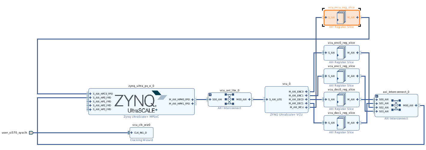 1. VCU 模块在PL侧,一共有五个AXI接口,它们分别是两个 Encoder AXI,两个 Decoder AXI, 和一个 MCU AXI。两个 Encoder/Decoder 的 AXI 接口必须都连接到 MPSoC PS,即使只用一路编码,或者一路解码。运行时使用哪个引擎是 MCU 控制的,外界无法干预。