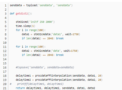 采集两个声道的数据算法: 在实验中,会发现通过单片机的调试系统收集数据的时候,往往会出现大概率的丢失数据的现象,所以在下面的代码中,getdist2()函数中,对于双通道的数据通过函数 stm32cmdata(…)接受数据的时候,需要通过100次的循环,接收,直道接收到的数据的长度等于2048(这是在单片机程序中设定的数据缓存区的长度)。