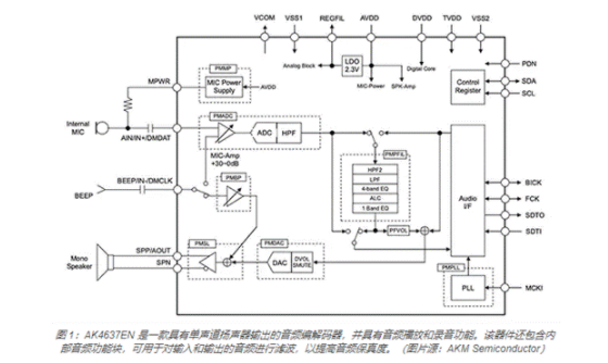 我们以 AKM Semiconductor 的 AK4637EN 24 位音频编解码器为例,这是一款凭借成本低、音频能力强大而颇受欢迎的音频编解码器(图 1)。AK4637EN 具有所有这些功能,还配有一个蜂鸣器输入,可以使用所需频率的脉宽调制 (PWM) 信号来产生蜂鸣。