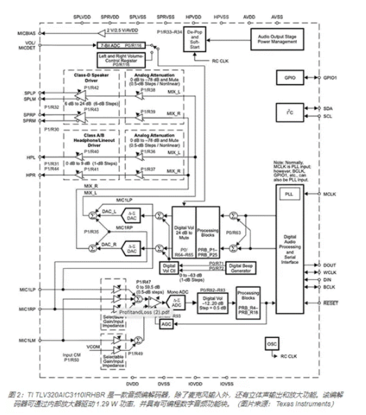 首先考虑的是音频编解码器的输出要求。有几种不同的选择。例如,AK4637EN 有一个线路输出和一个单声道扬声器输出。还有其他编解码器,比如 Texas Instruments 的 TLV320AIC3110IRHBR 立体声音频编解码器,可以 1.29 W 的功率驱动两个扬声器(图 2)。