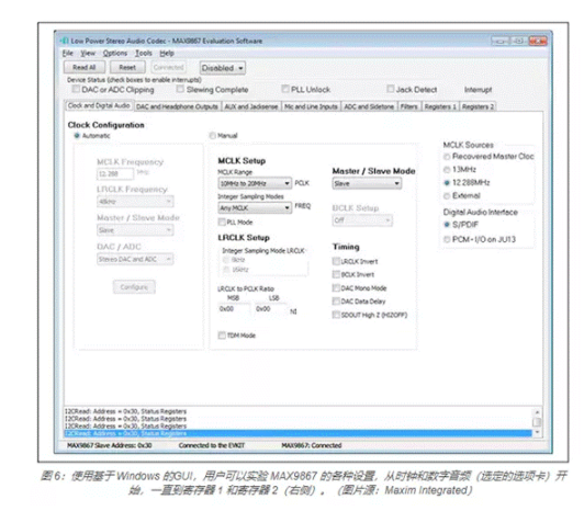 该套件由电路板和相关软件组成,配置为使用 Sony/Philips 数字接口 (S/PDIF) 发送和接收音频数据,但也可以设置为使用 I2S。该套件有两个 RCA 输入插孔,两个 3.5 毫米 (mm) 模拟输出耳机插孔,以及光纤接收和发射模块。该软件兼容 Windows,通过 USB 电缆连接 PC 时会打开一个图形用户界面 (GUI),开发人员可在该界面中对 MAX9867 的设置进行实验(图 6)。