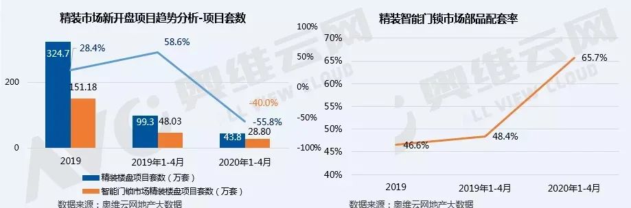 根据奥维云网2020年4月300+城市调研数据显示,今年1-4月,国内精装市场新开盘项目套数43.8万套,而配置了精装智能门锁部品的精装房源项目共开盘了28.8万套,其精装智能门锁部品配套率为65.7%,与去年同期配套率份额相比提升了17.3%。