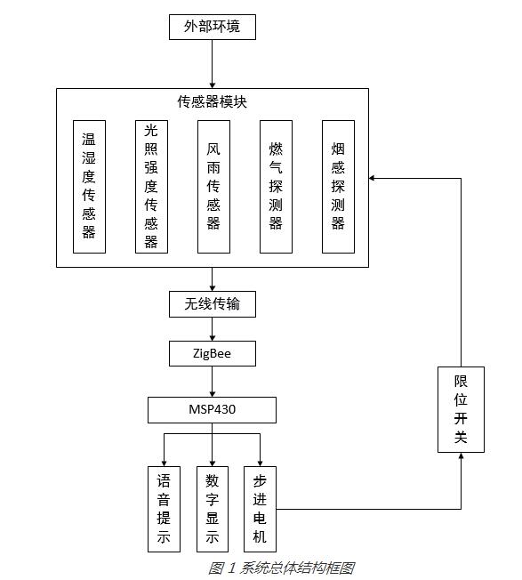 本设计的思路是通过各个传感器检测周围环境的变化, 将检测到的数据输入 MSP430 单片机内,由该单片机判断并执行相应操作以控制外部设备。整个程序的过程分模块进行, 让程序的可读性得到增加,能够实现分块调试。