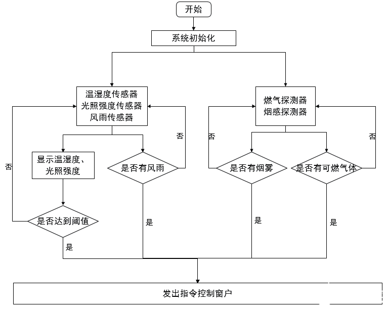 燃气探测器采用的是高质量的气体传感器、微处理器并结合精密的温度传感器,烟感探测器是一种技术先进、工作稳定可靠的离子式烟雾传感器,两种传感器环境适应范围宽, 工作稳定,采用吸顶安装方式,简单方便,使用广泛。当环境中可燃气体浓度或烟雾浓度达到所设定阈值时,燃气探测器或烟感探测器在发出报警信号的同时也把数据传送给主控模块进行处理,从而控制窗户的开关,这样可以有效的降低安全事故的发生率,减少损失。