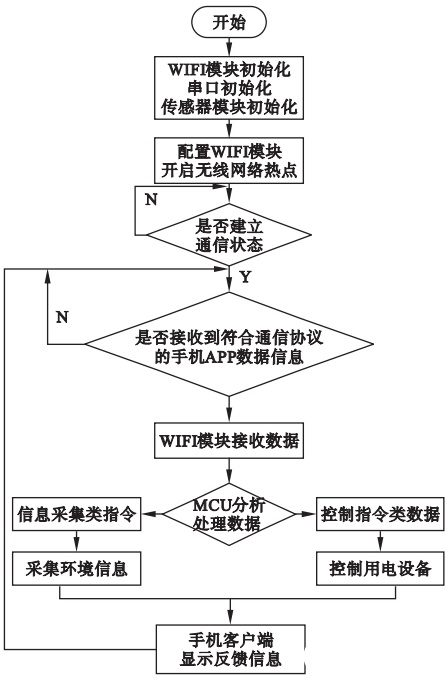 智能家居控制终端软件系统核心是 WIFI 网络控制和 MCU 控制系统,加上环境监测系统、智能安防系统、智能照明系统、智能家电系统等几个软件子系统构成终端软件系统. 其中 WIFI 网络控制和 MCU控制系统是智能家居控制终端的核心,系统主程序流程如图 8 所示.