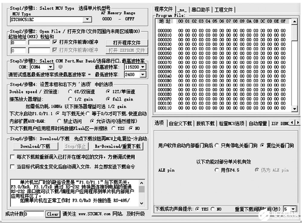 在实现程序的编写后,需要对程序进行导入。对于程序导入软件,选择 STC- ISP 进行程序导入。如图 5 所示。STC-ISP 是一款单片机下载编程烧录软件,是针对 STC 系列单片机而设计的,可下载 STC89 系列、12C2052 系列和 12C5410 等系列的 STC 单片机,使用简便,现已被广泛使用。