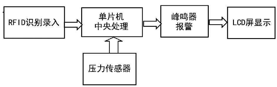 功能模主要有 5 个步骤: RFID 识别录入、压力传感器、单片机中央处理、蜂鸣器报警、LCD 显示。