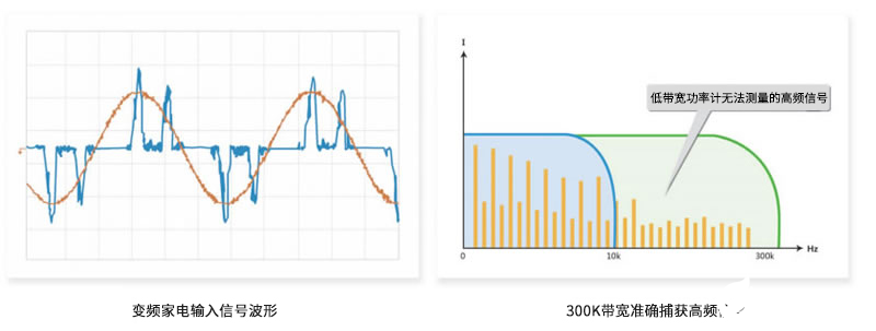 如图4所示我们可以看到低带宽的功率计,信号中的高频成分被模拟前端电路滤除,从而造成能量丢失。致远电子功率计300KHz的带宽完全满足变频家电等新技术产品的功耗测量。