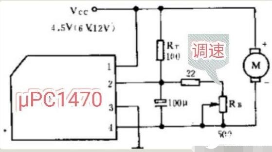 上图为μPC1470构成的电机稳速电路,该IC为日本NEC公司生产的稳速IC,其只有4个引脚,①脚和③脚为正负电源端,②脚为控制端,④脚为输出端,电机接在该端与电源正极之间。若电机转速较慢,通过调节可调电阻Rb即可提高电机转速。