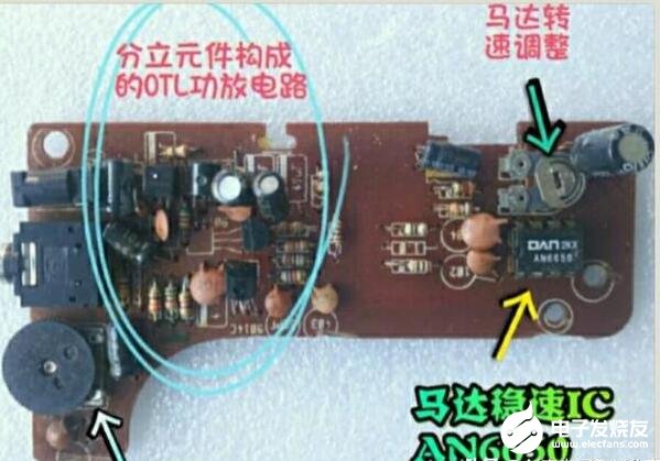 一般录音机电路板上都有用于调速的可调电阻。像上图电路板上的AN6650是3V磁带放音机中常用的一款低压稳速IC,其旁边的可调电阻就是用于电机调速的,调节其阻值即可改变电机转速。