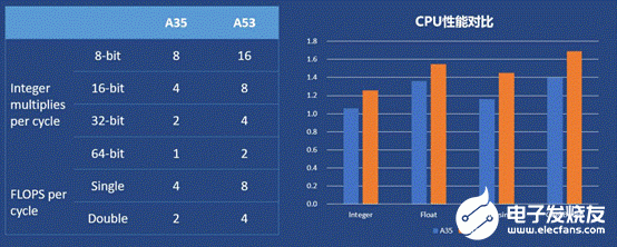后续的A35实际更多的着眼于效率,它在性能方面定位于A7同档,整体微架构与A53也很相似——前端有一些变化,在取指单元上做了重新设计,取指带宽对能效做了权衡,指令队列更小;Neon/浮点管线在面积效率上有变化。